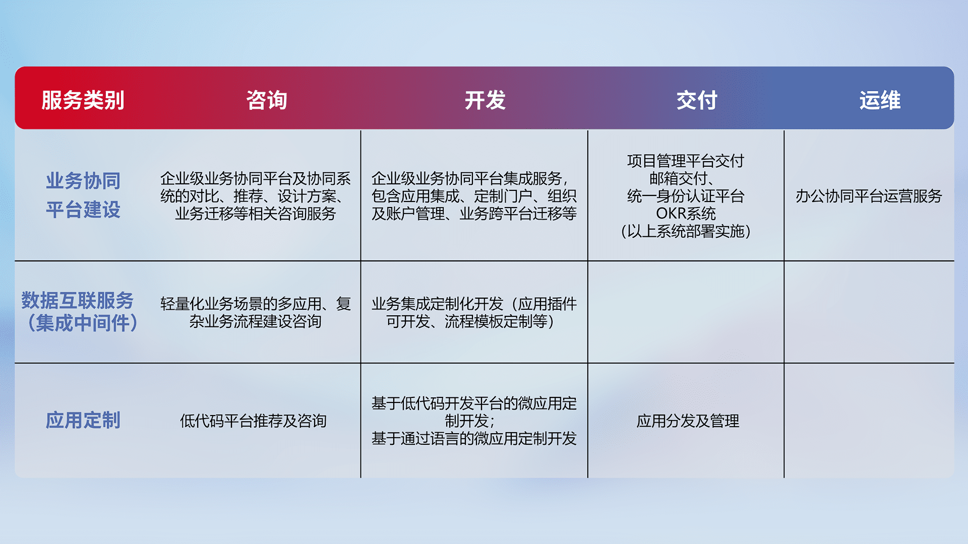 针对钉钉、、企微、、、、IDaas等平台级产品提供产品的规划、、方案、、、交付、、定制化开发等服务,,,实现如统一协同办公、、、智能客户服务、、混合会议管理、、、、智能数据查询、、、、等业务场景,,实现数字化转型。。。。