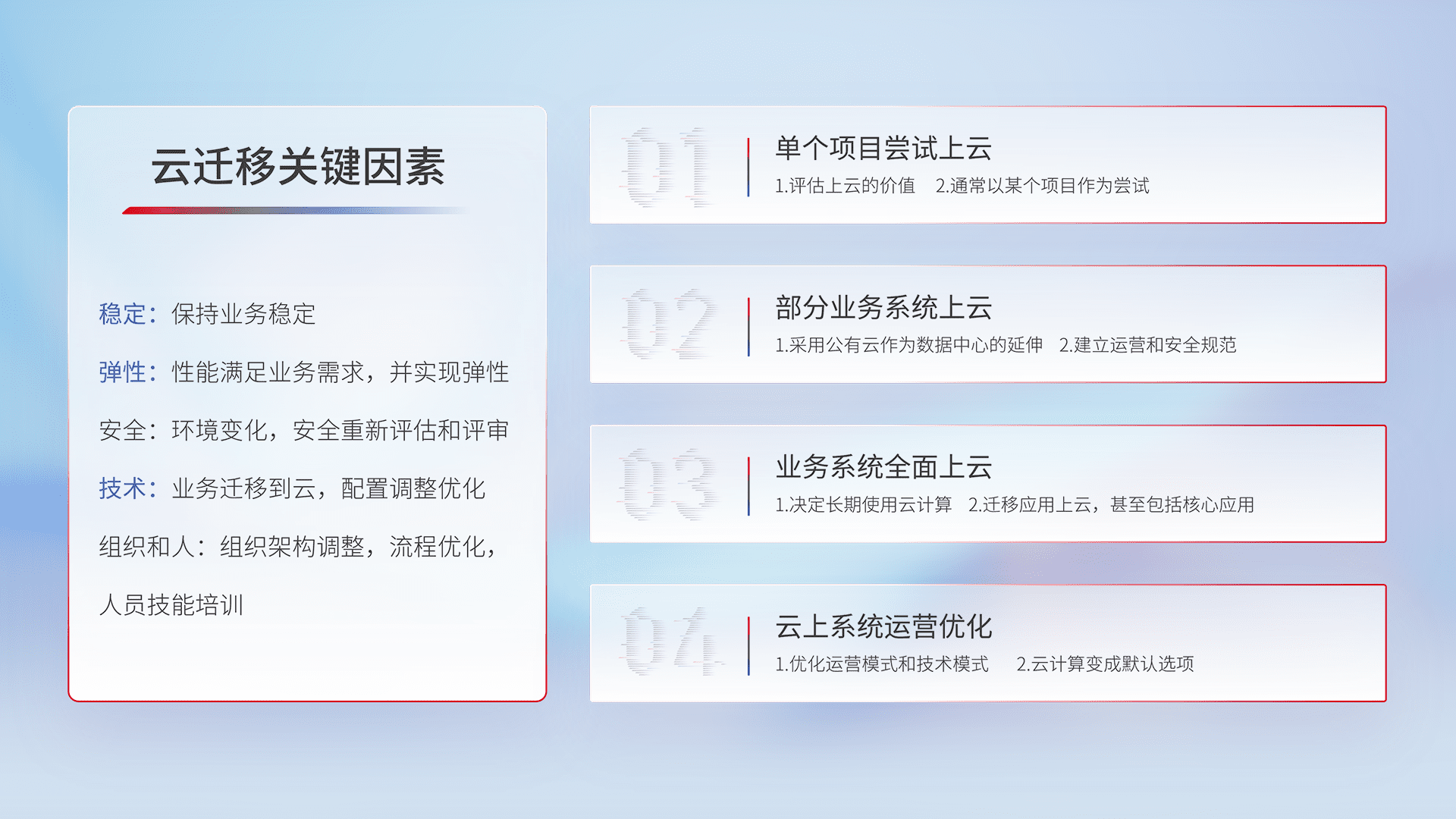 结合实际业务,,从规划设计、、、云平台选型、、、云原生改造、、、、数据迁移、、、、集成交付,,迁移全过程为客户识别最佳上云路径,,做好风险识别管理,,,,设计网络架构、、、、身份权限、、安全审计合规、、、操作审计、、日志审计、、监控告警策略、、、、多站点容灾设计等,,对云上基础设施进行整体规划,,提升IT治理水平,,以满足弹性、、、、高可用、、高性能的需求。。