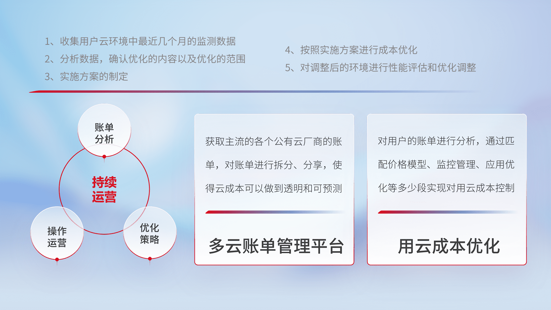 通过多云纳管,,,以统一的资源数据模型把客户的云资源进行抽象和封装,,,进而实现对多云资源的统一操作,,,保障云资源管理的可靠性、、稳定性与可用性。。。。量身定制化运维内容,,,,配置、、、、开发运维、、、、补丁管理、、备份、、、、监控、、认证和访问管理、、审计和日常巡检等,,,,保障在用云过程中的可靠度,,,稳定度以及高可用率。。。